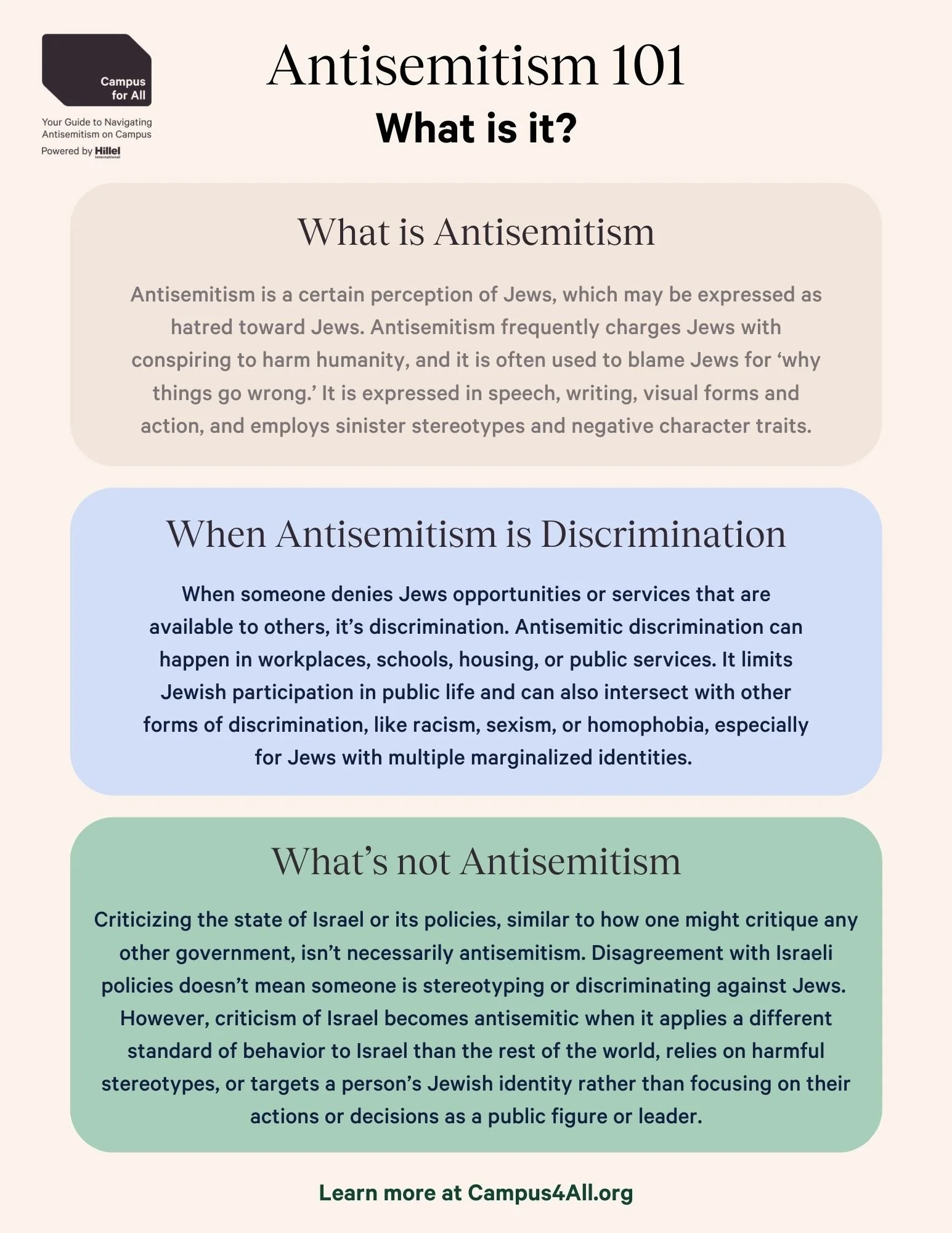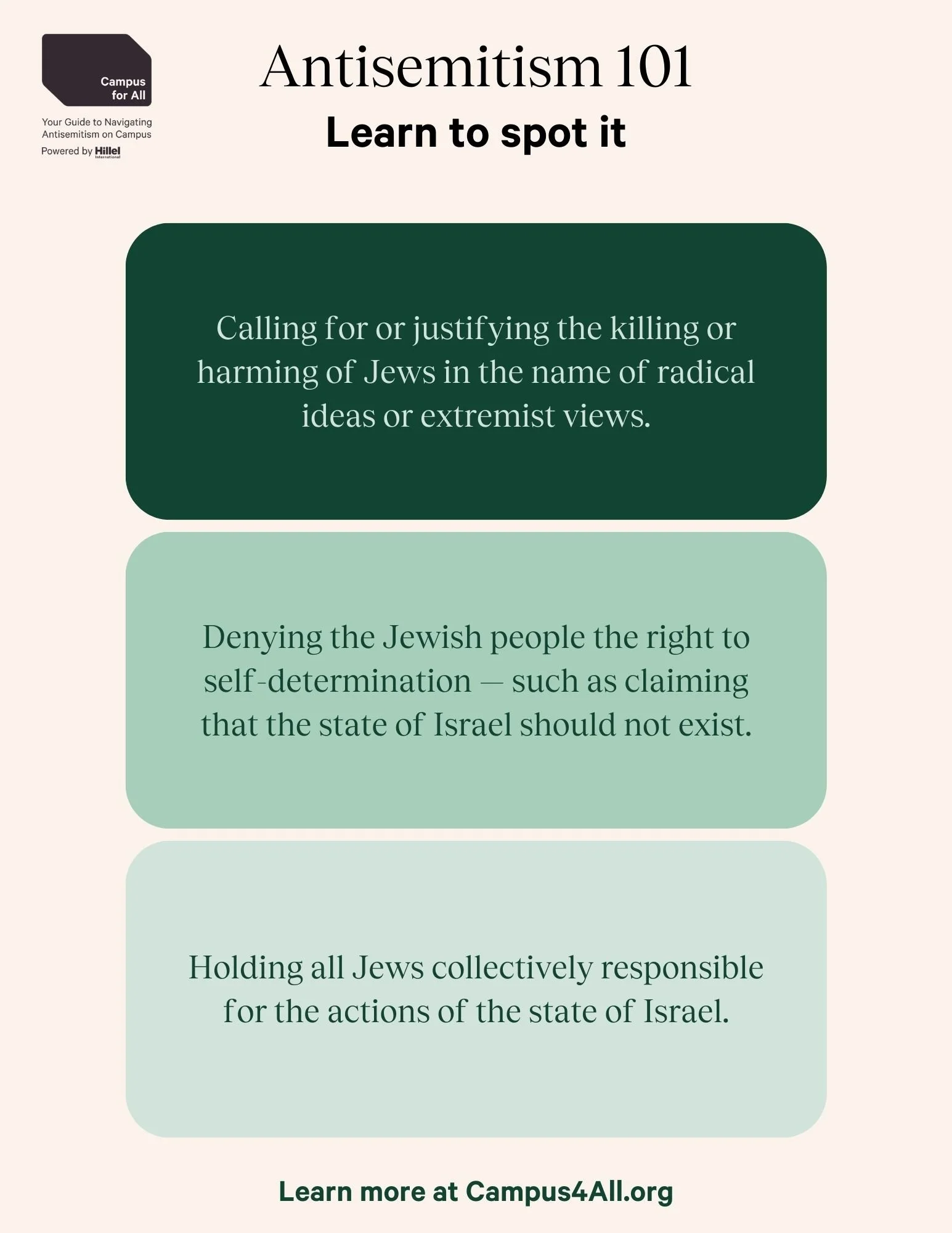 Every Jewish student deserves to feel safe, confident, and supported on campus, and Hillel is there to make sure that’s true. That’s why Hillel created Campus4All.org — a one-stop-shop for identifying and reporting antisemitism, knowing and understanding Jewish students’ rights on campus, and finding trustworthy, verified voices to help separate fact from fiction about Israel.